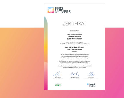 Die Qualität unserer Leistungen zu verbessern, ist das oberste Ziel von ProMovers. ProMovers etabliert ein Qualitätsmanagementsystem und ein Zertifikat, auf das sich Auftraggeber uneingeschränkt verlassen können.